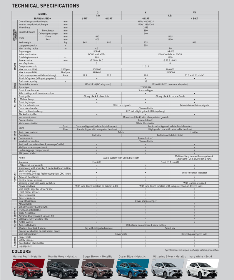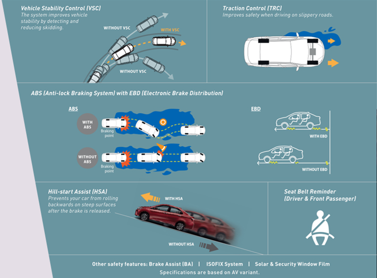 Sistem Vehicle Stability Control (VSC) membantu mengekalkan kestabilan kenderaan dengan mengesan dan mengurangkan risiko tergelincir, manakala Traction Control (TRC) meningkatkan keselamatan ketika memandu di jalan licin. Sistem ABS (Anti-lock Braking System) dengan EBD (Electronic Brake Distribution) memastikan brek berfungsi dengan optimum, mengurangkan risiko tergelincir dan mengekalkan kawalan kenderaan semasa membrek. Hill-start Assist (HSA) pula mencegah kereta bergerak ke belakang semasa menaiki cerun, dan Seat Belt Reminder mengingatkan pemandu serta penumpang hadapan untuk sentiasa memakai tali pinggang keledar. Tambahan ciri keselamatan lain termasuk Brake Assist (BA), ISOFIX System, serta Solar & Security Window Film, menjadikan Bezza pilihan ideal bagi mereka yang mengutamakan keselamatan tanpa mengorbankan keselesaan.