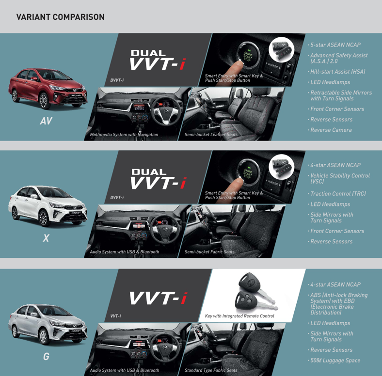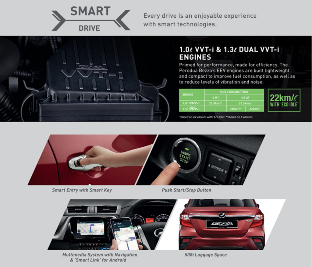 Perodua Bezza direka untuk memberikan pengalaman pemanduan yang lancar, efisien, dan menyeronokkan melalui gabungan teknologi pintar dan enjin berprestasi tinggi. Dilengkapi dengan pilihan enjin 1.0L VVT-i dan 1.3L Dual VVT-i, Bezza menawarkan prestasi yang responsif sambil mengekalkan penggunaan bahan api yang rendah serta mengurangkan getaran dan bunyi bising. Sistem Smart Entry dengan Smart Key membolehkan akses mudah tanpa kunci tradisional, manakala Push Start/Stop Button memberikan kemudahan memulakan enjin dengan satu sentuhan. Untuk keselesaan dan hiburan, Bezza menawarkan Multimedia System dengan Navigasi & Smart Link untuk Android, membolehkan pemandu kekal berhubung dan mengikuti arah dengan mudah. Ruang but yang luas 508L menambah fleksibiliti untuk membawa barangan harian atau bagasi, menjadikan Bezza pilihan ideal bagi mereka yang menghargai keselesaan, kemudahan, dan teknologi pintar dalam setiap perjalanan.