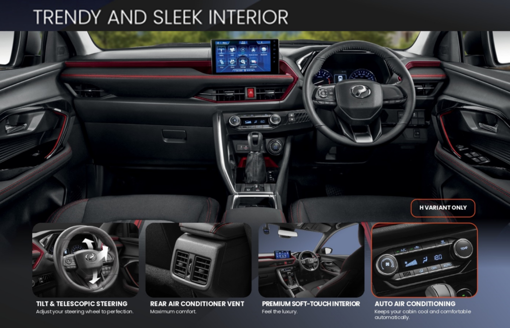 Keselesaan dipertingkatkan lagi dengan saluran pendingin udara belakang, memastikan suasana yang selesa untuk semua penumpang, tanpa mengira tempat duduk mereka. Traz juga dilengkapi dengan antara muka yang inovatif dan mesra pengguna, dengan paparan definisi tinggi yang memberikan akses mudah kepada semua kawalan kenderaan yang penting. Sistem penyaman udara automatik membawa kemudahan ke tahap yang lebih tinggi, secara automatik menyesuaikan suhu untuk mengekalkan persekitaran yang selesa di dalam kabin. Eksklusif untuk varian H, ciri-ciri ini digabungkan untuk memastikan pengalaman pemanduan yang selesa dan bergaya, membolehkan Traz bukan sahaja menonjol dari segi penampilan, tetapi juga dari segi fungsi.
