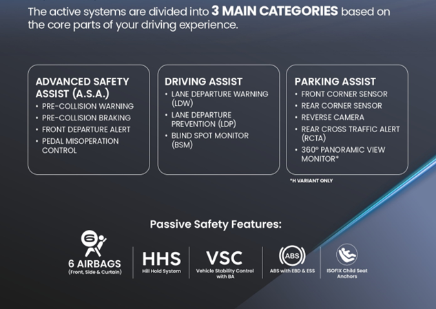The Perodua Traz is not only about performance and fuel efficiency but also incorporates a robust suite of active and passive safety features, ensuring comprehensive protection for all occupants. The vehicle’s advanced safety systems are divided into three main categories: Advanced Safety Assist (A.S.A.), Driving Assist, and Parking Assist, each designed to enhance different aspects of your driving experience. The A.S.A. system includes Pre-Collision Warning, Pre-Collision Braking, Front Departure Alert, and Pedal Misoperation Control, which work in harmony to prevent accidents and enhance overall driving safety. The Driving Assist system includes features such as Lane Departure Warning (LDW), Lane Departure Prevention (LDP), and Blind Spot Monitoring (BSM) to provide additional support during your journey. The Parking Assist system adds convenience and security with features like Front and Rear Corner Sensors, Reverse Camera, Rear Cross Traffic Alert (RCTA), and a 360° Panoramic View Monitor (available in the H variant). Additionally, the Traz is equipped with six airbags (front, side, and curtain), Hill Hold System (HHS), Vehicle Stability Control (VSC), ABS with Electronic Brake Distribution (EBD), and ISOFIX child seat anchors. These passive safety features ensure that the Traz offers superior protection, making it a top choice for those who value both safety and comfort.