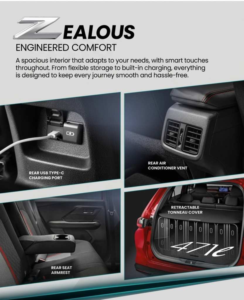 Traz juga menawarkan tempat rehat tangan belakang, meningkatkan keselesaan bagi penumpang belakang semasa perjalanan jauh. Dari segi praktikaliti, kenderaan ini dilengkapi dengan penutup tonneau yang boleh ditarik di ruang but, memberikan penyimpanan yang mudah dan melindungi barang-barang anda sambil mengekalkan ruang but yang kemas dan teratur. Dengan ruang kargo yang luas sebanyak 471 liter, Traz memastikan anda dapat membawa semua barang penting tanpa sebarang kompromi. Setiap aspek interior Traz direka dengan kemudahan dan keselesaan dalam fikiran, menawarkan keseimbangan sempurna antara keselesaan, fungsi, dan fleksibiliti untuk memenuhi keperluan pemandu moden.