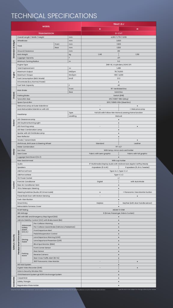 The Traz is engineered with Perodua Smart Drive Assist technology, which enhances driving convenience and safety, offering an intuitive driving experience. Whether you are navigating busy urban roads or embarking on long-distance journeys, this vehicle guarantees a smooth and efficient ride. Further bolstering its credibility, the Traz boasts a 5-star ASEAN NCAP safety rating, solidifying its status as a reliable and safe choice for all drivers. With its perfect balance of fuel efficiency, cutting-edge technology, and proven safety, the Perodua Traz stands out as a vehicle that you can trust for years to come.